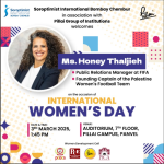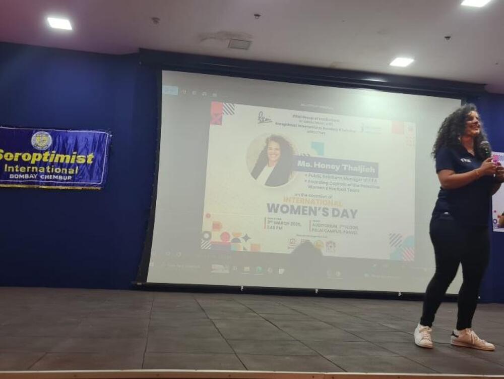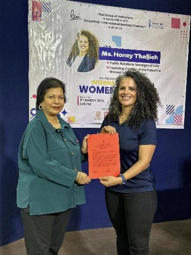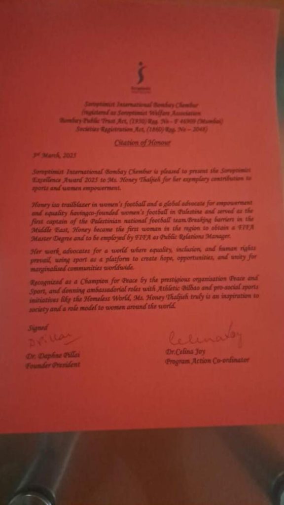 On the occasion of International Women’s Day, Soroptimist Excellence Award 2025 was conferred on Ms. Honey Thaljieh, Corporate Communications Manager for FIFA – Federation Internationale de Football Association. Ms. Thalijeh is the co-founder of women’s football in Palestine, the first captain of the Palestinian national team, and the first Arab woman to obtain a FIFA Master and work at FIFA. Her work advocates for a world where equality, inclusion, and human rights prevail, using sports as a platform to elevate marginalised communities worldwide.