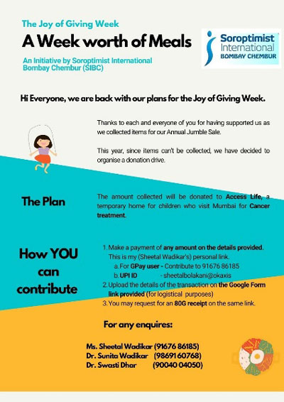 The project was a fundraiser with the specific aim of sponsoring one week at the rate of Rs. 500 per family of three (child and two parents) meal for the inmates of Access Life. Access Life is an Indian NGO that provides support to children (who are suffering from cancer) and their families (two parents). The organization collaborates with Tata Memorial Cancer Hospital, Mumbai, and supports these families with boarding, meals as well as medical support and transportation from the Access Life Centre to the hospital and back. The names and financial details for fund collection were provided via a Google Form and funds were collected between 1st to 25th October, 2021. A total sum of Rs. 1,43,700/- was collected. This money was handed over to Access Life on 12th November, 2021. The project focused on SDG #2 “Zero Hunger” and SDG #3 “Good Health and Well Being”.