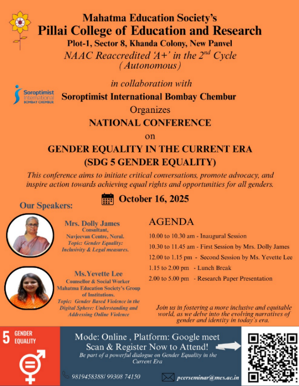 SI Bombay Chembur collaborated with Pillai College of Education and Research, Panvel, to organise two national conferences in online mode. The second conference was held on 16th October on the theme of “Gender Equality in the Current Era”, to serve as a platform for for reflection, dialogue, and the dissemination of research on Gender Equality, focusing on the evolving dimensions of gender, inclusivity, and empowerment in today’s digital and diverse world.
