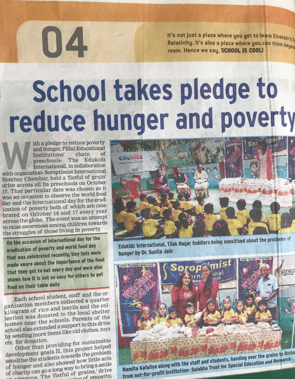 SIBC in association with Edukidz International Tilak Nagar and Edukidz International, Powai successfully organized the Fistful of Grains drive on 17th October, 2019. Discussions on the issues of poverty, food wastage and hunger instilled the values of empathy, kindness and service to society among the 60 tiny toddlers. Other than providing for SDG 2, this project helped sensitize the students towards the problem of hunger and also how, little acts of charity can go a long way to bring a smile on someone. The donations were sent to the local shelters ‘Sulbha’, home for differently abled children and ‘Vatsalya’, an orphanage.