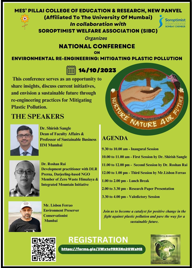 SIBC in association Pillai College of Education and Research organized a National Level Educational Webinar on the topic “Environmental Re-engineering: Mitigating Plastic Pollution” on the 14th October, 2023. Experts in the field shared their valuable knowledge about mitigation of plastic pollution. Around 100 participants including teachers, students and environmental activists attended the session.