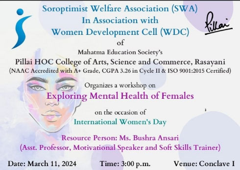 SI Bombay Chembur in collaboration with the Women Development Cell of Pillai HOC College of Arts Science and Commerce, Rasayani, organised a workshop on Exploring Mental Health of Females on 11th March, 2024 on the occasion of International Women’s Day. The theme of this day was “Invest in Women: Accelerate Progress”.