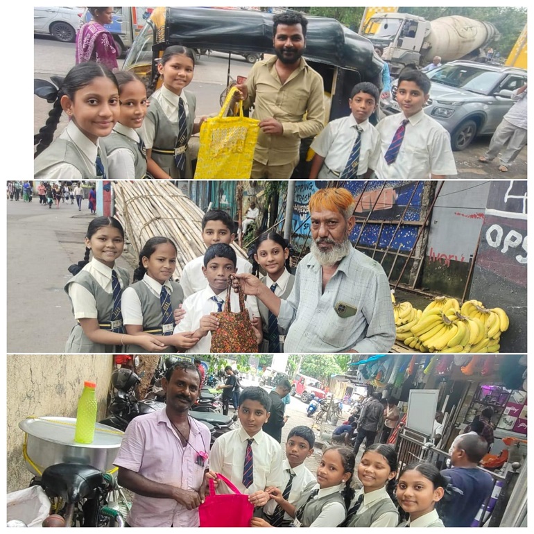 We also collaborated with Chembur English High school and conducted a slew of activities on the theme – “Say No to Plastic“. The celebration aimed to educate students about the harmful effects of plastic and encourage the use of eco-friendly alternatives. Some of the activities were – essay writing, poster making, making of cloth bags and distributing among vegetable vendors who were most happy with the gesture. Another exciting activity was ‘Best Out of Waste’ – using wrappers to make a pen holder, wall hanging, pouches etc. The students created innovative posters and products advocating for a plastic-free world, effectively spreading the message of sustainability.